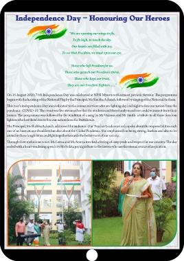 On 15 August 2020, 74th Independence Day was celebrated at NPSI Mysore with utmost patriotic fervour. e programme